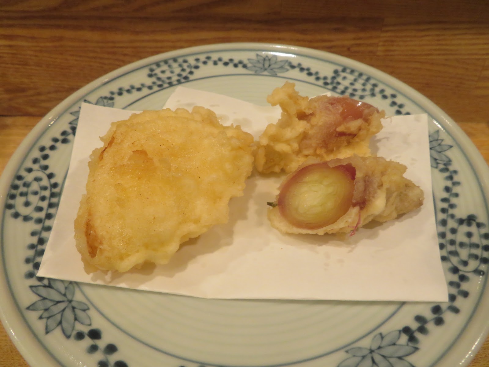 天ぷらのセット。左の大根おろしがトマトが入っているようで、つまみになります(私はそうしているだけですが)。